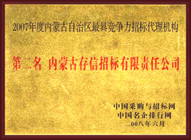 • 2008年度內(nèi)蒙古自治區(qū)最具競(jìng)爭(zhēng)力招標(biāo)代理機(jī)構(gòu)第一名