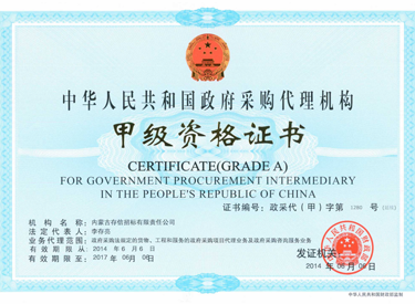 • 中華人民共和國(guó)政府采購(gòu)代理機(jī)構(gòu)甲級(jí)資格證書